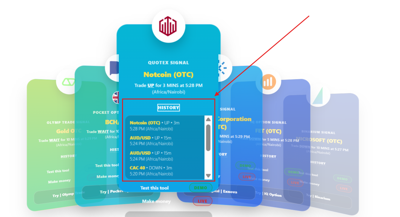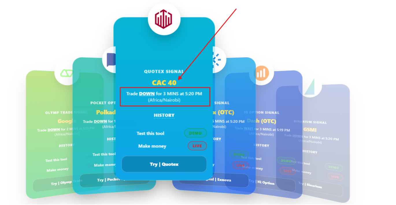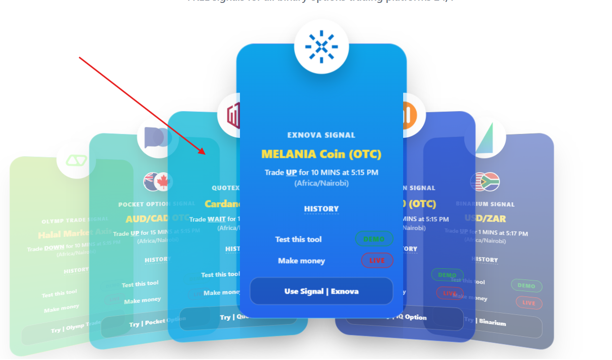The image below shows an arrow pointing at Quotex. You click on Quotex, and that card comes forward with the signals.